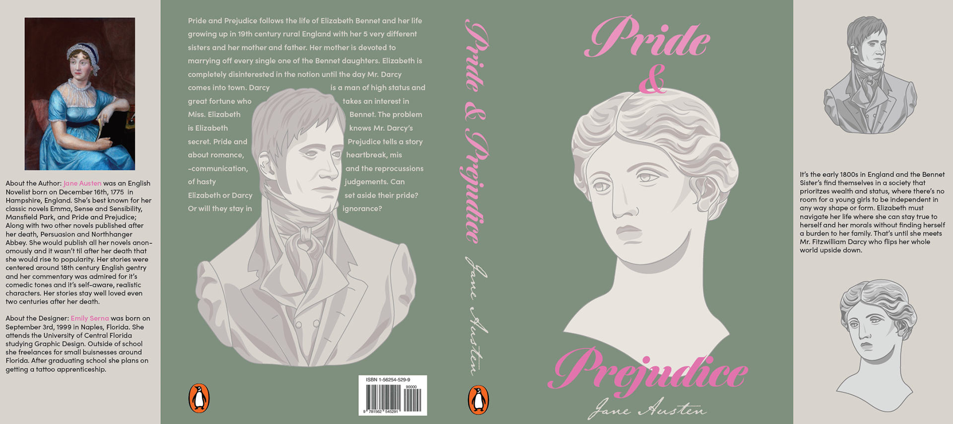 For this beloved book, Pride and Prejudice was given a modern look for it’s classic tale. Aimed towards book collectors who can’t get enough of the many variations this book can be designed. For my cover I decided to focus on a pivotal moment in the story where Elizabeth starts to put her own prejudices aside at Darcy’s estate while in his gallery While staring at Mr. Darcy’s sculpture Miss. Bennet thinks to herself that maybe she had been mistaken on his character all along.